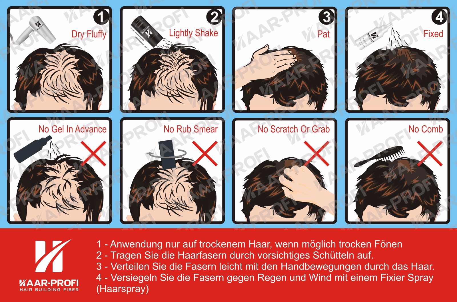 - Sekundenschnell dichteres Haar. Durch die Wirkung spezieller Microfasern